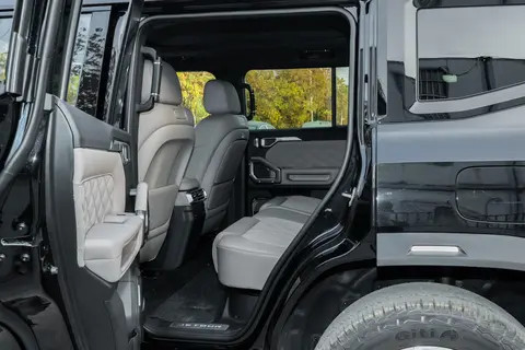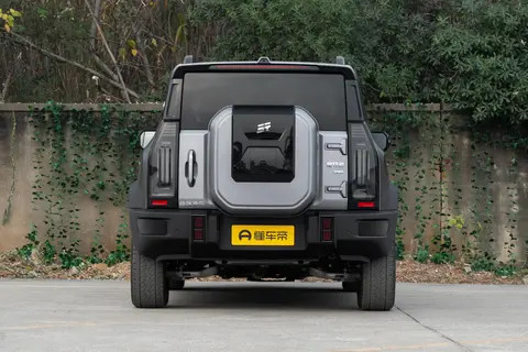 车辆尾部的造型宽大厚实,车顶配备了高位刹车灯,背负式的“小书包”设计是硬派越野车常用的元素,提升了一定的辨识度,由于尾门采用的是则开门的方式,所以尾灯为两侧竖向的设计,底部则配备了粗壮的后包围,突显出一定的硬朗风格。