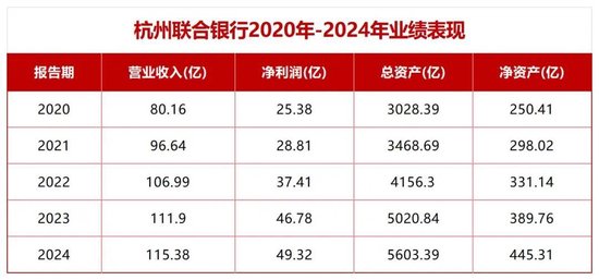 不过回看最近四个完整财报年度,杭州联合银行营业收入、净利均保持双增态势。2021年末至2024年末,杭州联合银行的营业收入同比增速分别为20.56%、10.70%、4.59%、3.10%,净利润增速分别为13.51%、29.85%、25.05%、5.43%。